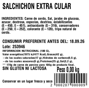 Nuestro salchichón extra cular de Embutidos Señora Julia es el resultado de una cuidada selección de carnes y una mezcla de especias que respetan la tradición riojana. Curado lentamente en un entorno natural, este salchichón se elabora sin gluten, sin lactosa y sin aditivos, garantizando un sabor puro y auténtico.